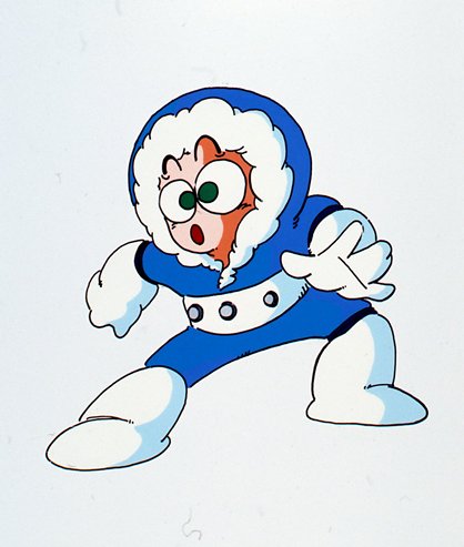 Iceman: A very tricky robot, he jumps and floats in the air while firing dangerous ice…ice…stuff at you. But the easy way to beat him is to shoot Elecman’s lightning bolts at him and he’ll be shocked that you won. (I’m sorry.)
